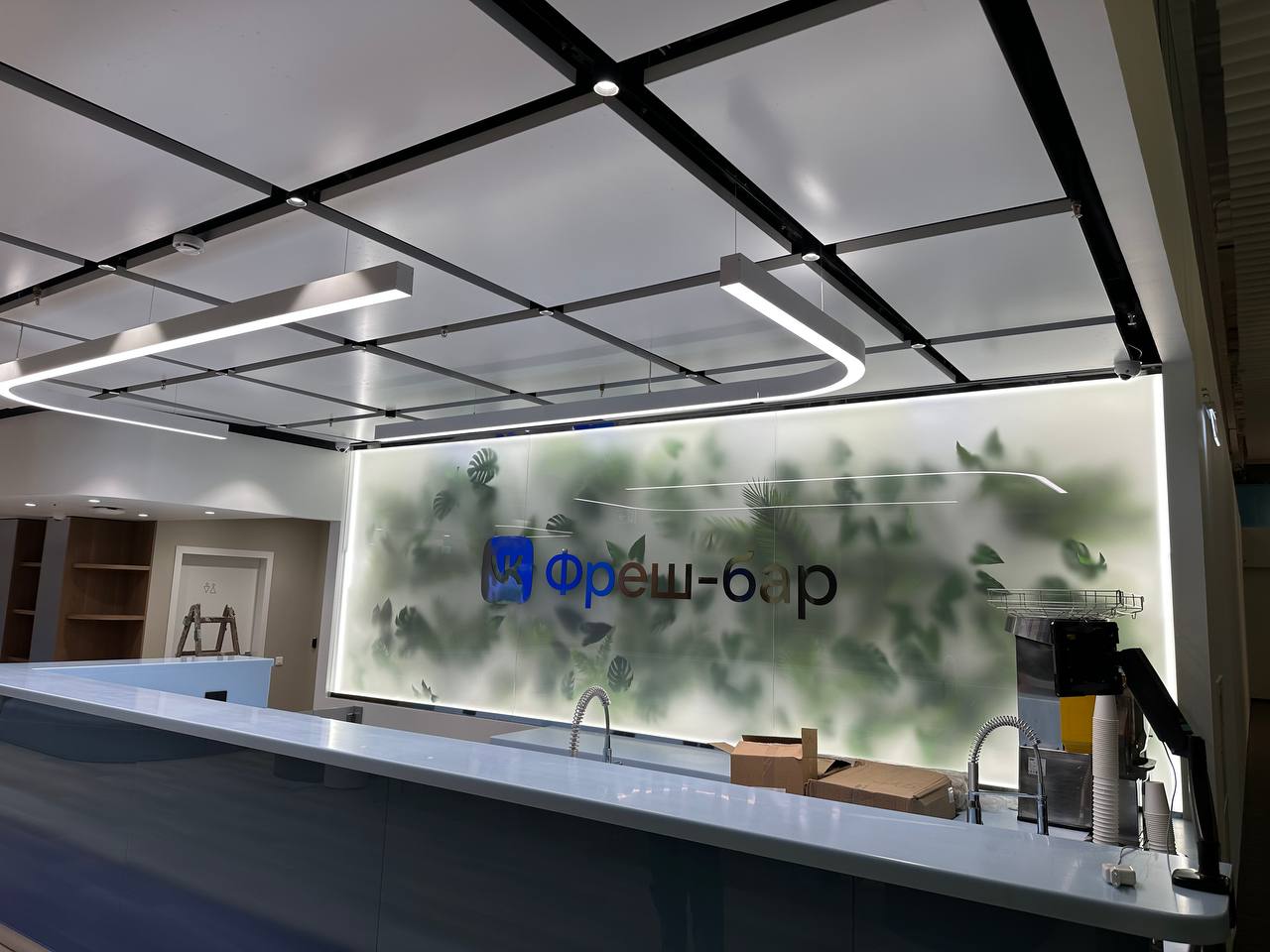 В рамках заказа были изготовлены панели с нестандартной геометрией, включая радиальные потолочные элементы, требующие высокой точности производства.