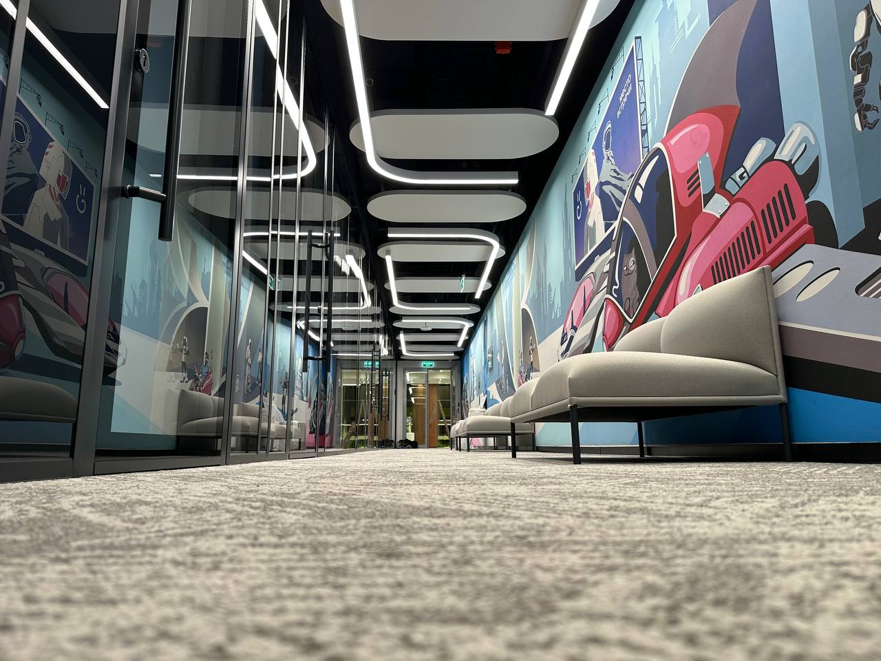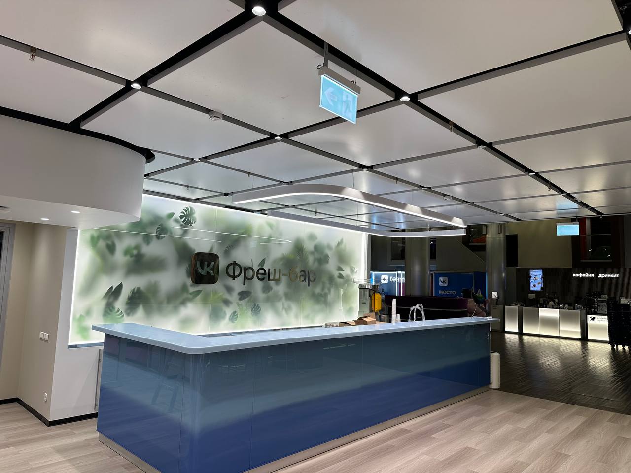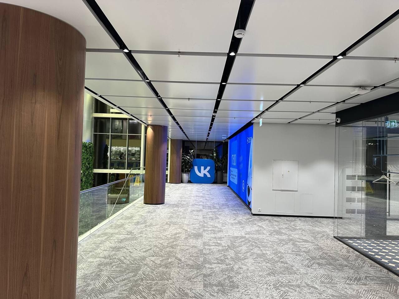 Проект для главного офиса ВКонтакте является примером реализации потолочных решений для офисных пространств высокого уровня.