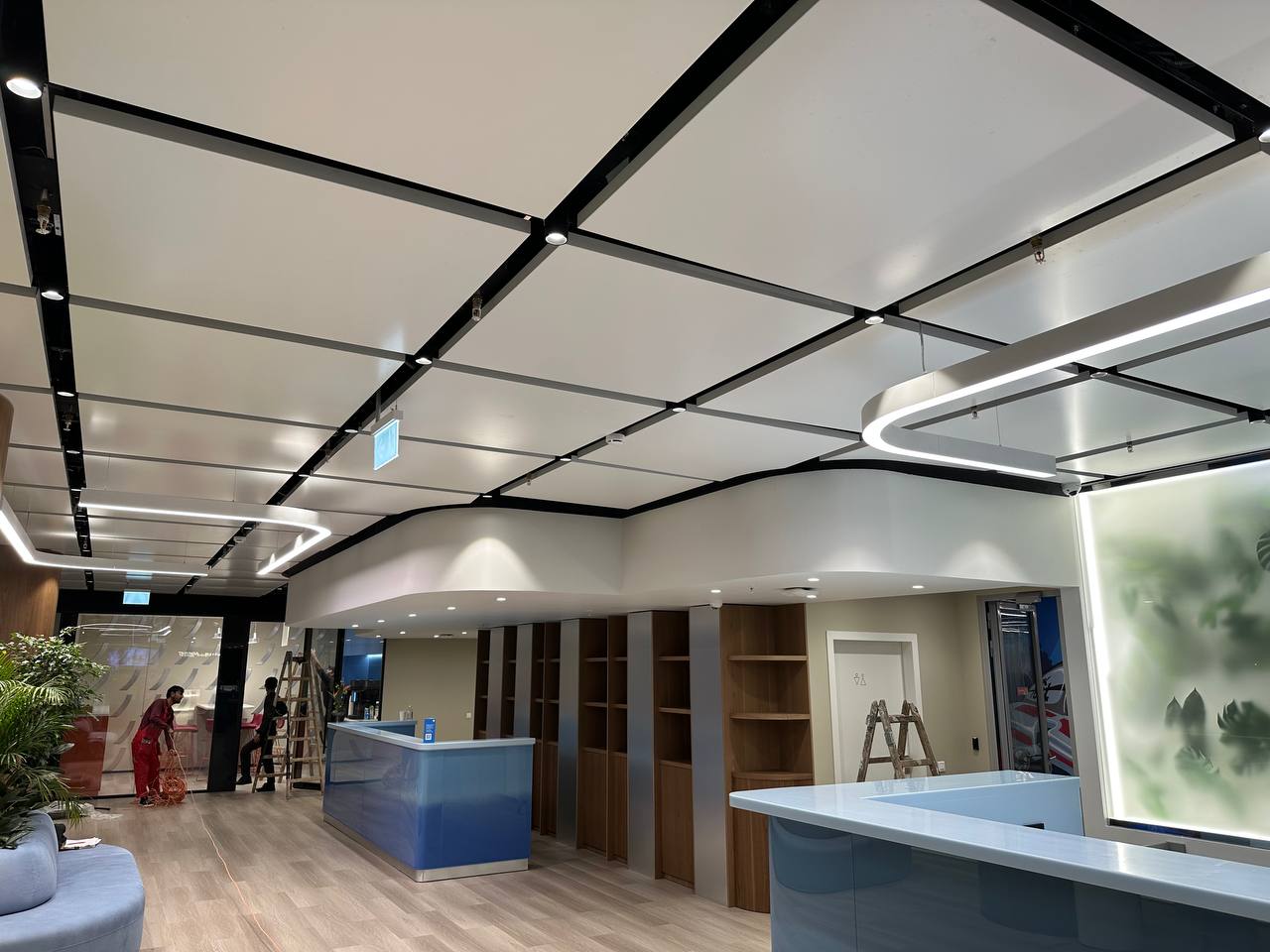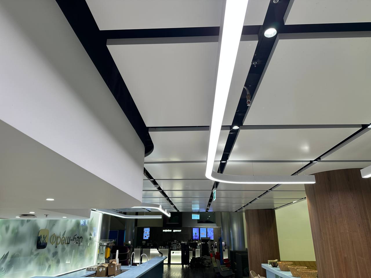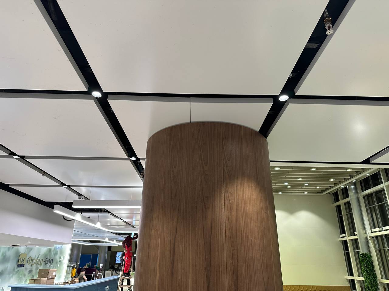 Основной задачей было изготовление потолочных панелей для объекта со сложной архитектурой потолка. В процессе производства были реализованы радиусные (радиальные) панели, которые требуют точной гибки и строгого соблюдения геометрии.
