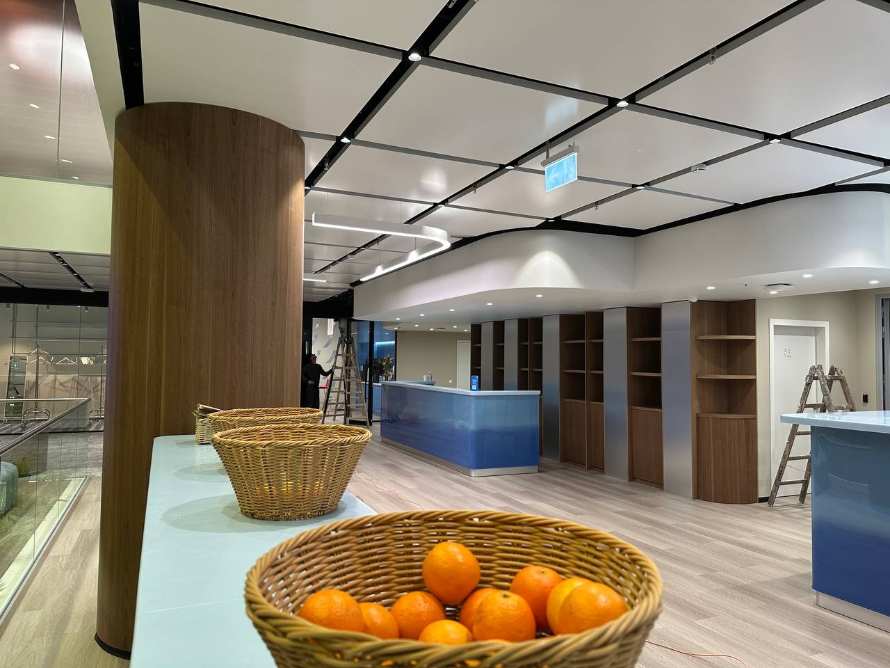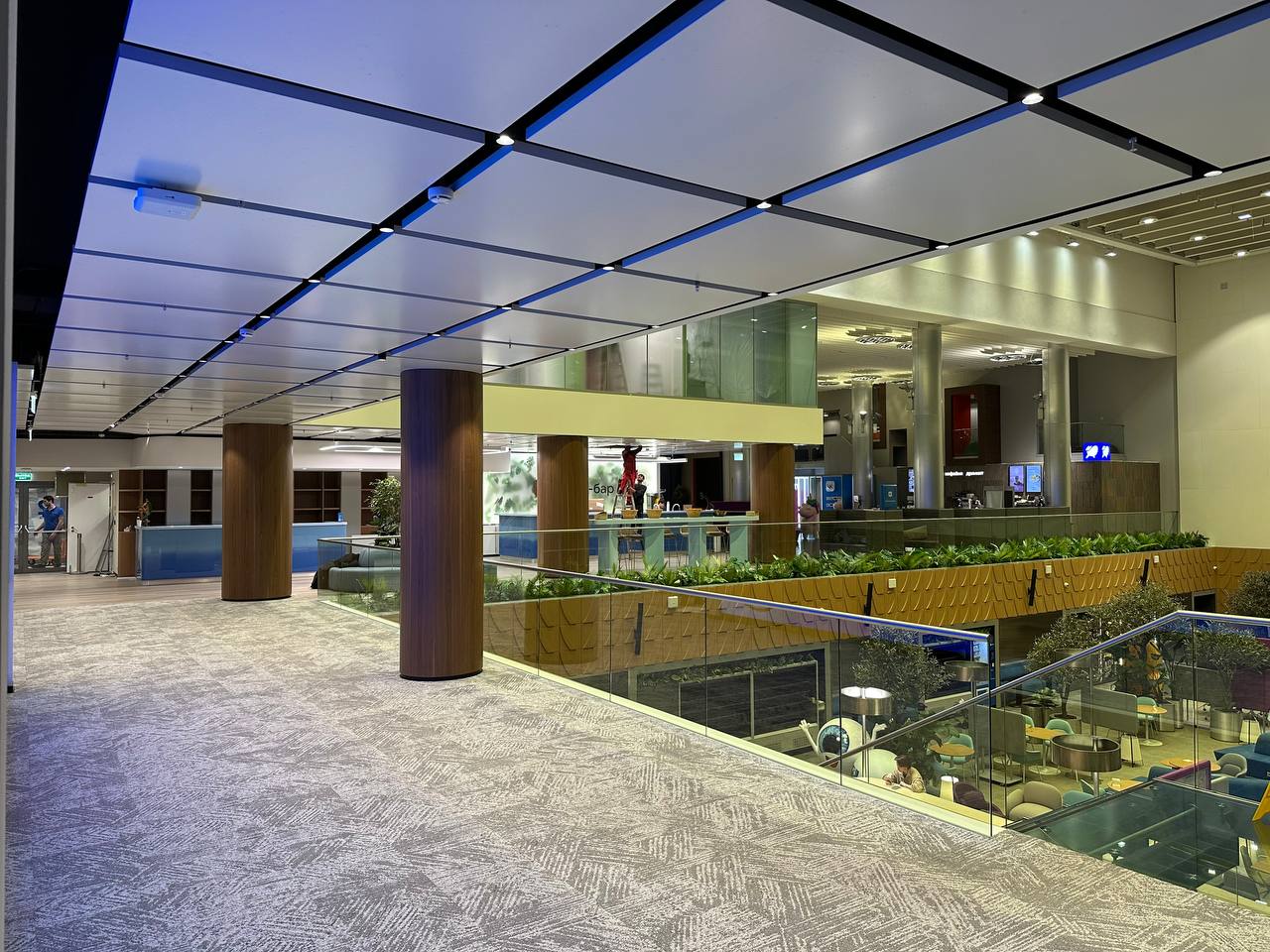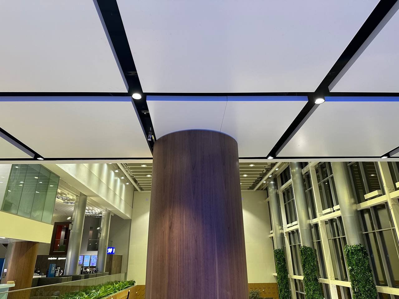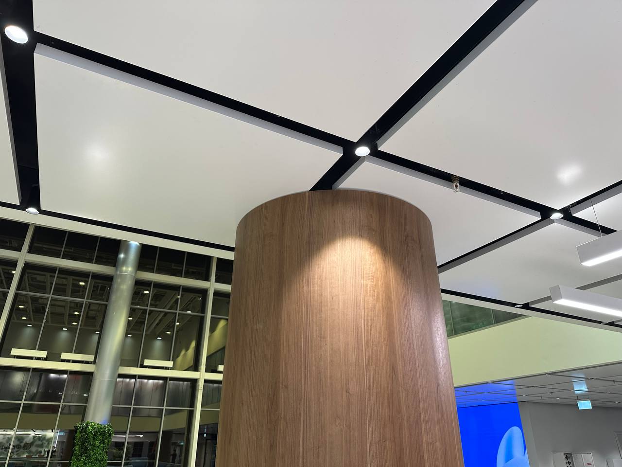 Основной задачей было изготовление потолочных панелей для объекта со сложной архитектурой потолка. В процессе производства были реализованы радиусные (радиальные) панели, которые требуют точной гибки и строгого соблюдения геометрии.